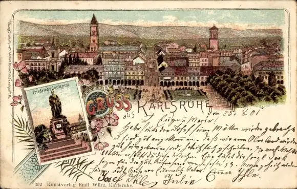 Litho Karlsruhe in Baden, Friedrichsdenkmal, Panorama