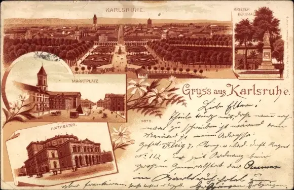 Litho Karlsruhe in Baden, Kriegerdenkmal, Hoftheater, Marktplatz