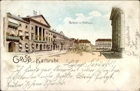 Litho Karlsruhe in Baden, Marktplatz, Rathaus