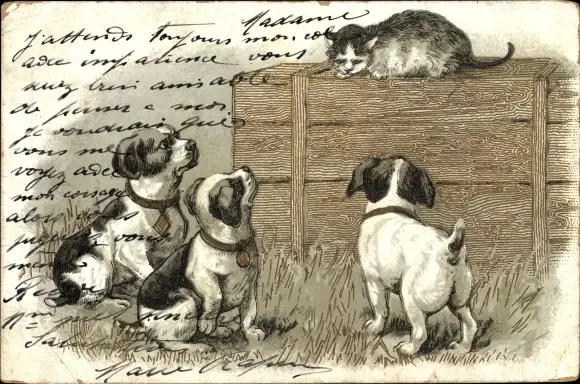Litho Katze auf einer Holzkiste, drei junge Hunde