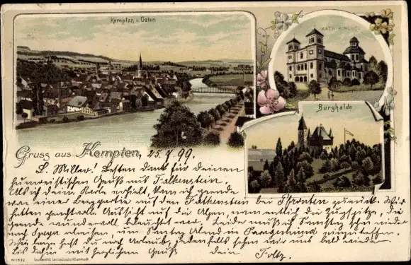 Litho Kempten im Allgäu Schwaben, Burghalde, Kirche, Totalansicht