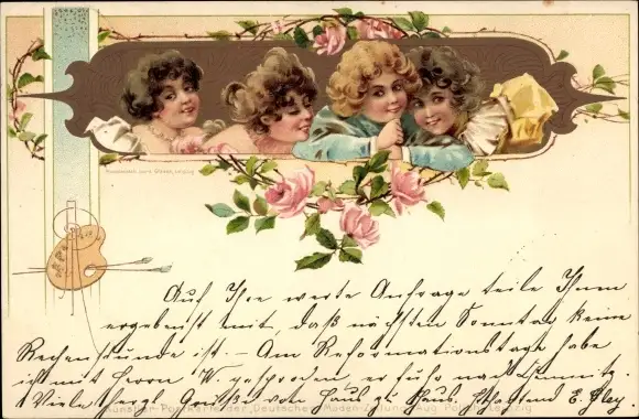 Litho Kinder-Portrait, Rosen, Kitsch, Farbpalette