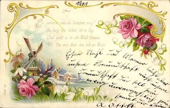 Litho Kitsch, Blumen, Rosen, Windmühle