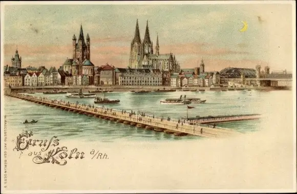 Litho Köln am Rhein, Rheinansicht, Brücke, Dom