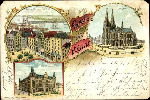 Litho Köln am Rhein, Rheinansicht, Hauptpost, Dom