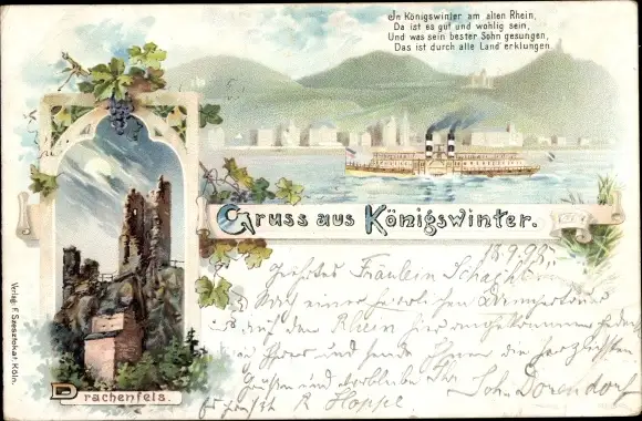Litho Königswinter am Rhein, Drachenfels, Salondampfer
