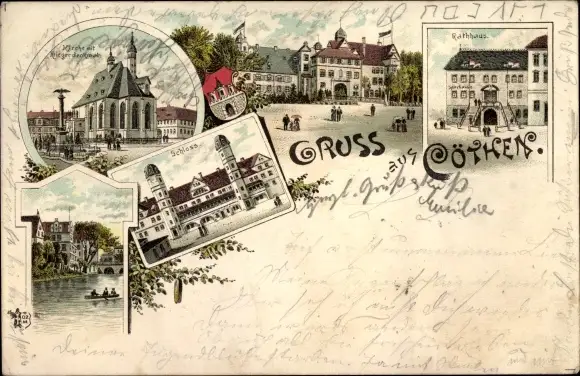 Litho Köthen in Anhalt, Rathaus, Kirche, Kriegerdenkmal, Schloss