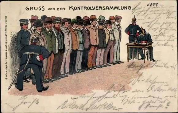 Litho Kontrollversammlung, Deutsche Soldaten in Uniformen, Männer stehen in der Reihe