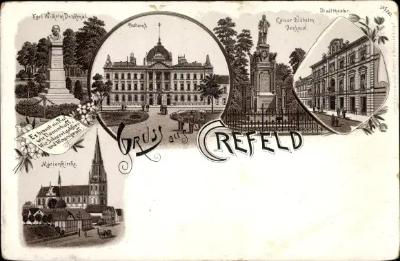 Litho Krefeld am Niederrhein, Postamt, Kaiser Wilhelm Denkmal, Marienkirche, Stadttheater