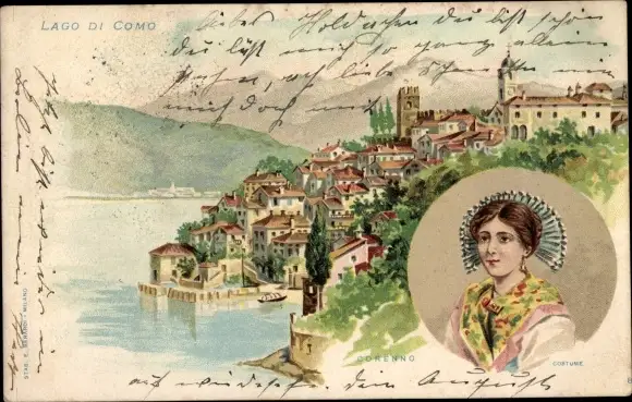 Litho Lago di Como Lombardia, Corenno, Frau in Volkstracht, Panorama vom Ort