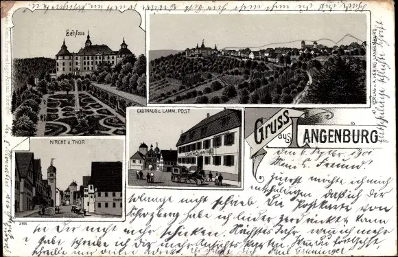 Litho Langenburg in Württemberg, Schloss, Gasthaus zum Lamm, Kirche, Tor, Totalansicht