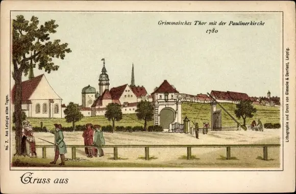 Litho Leipzig, Grimmaisches Tor mit der Paulinerkirche um 1780