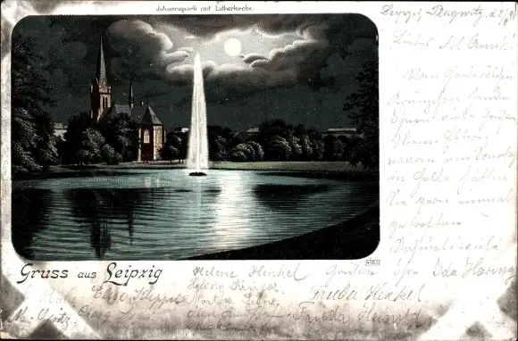 Litho Leipzig in Sachsen, Johannapark, Lutherkirche, Mondschein