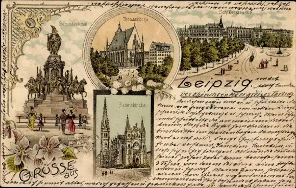 Litho Leipzig in Sachsen, Thomaskirche, Siegesdenkmal, Schillerstraße, Peterskirche