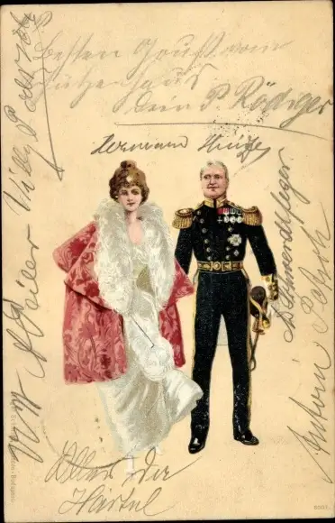 Litho Liebespaar, Soldat in Uniform, Frau in weißem Kleid