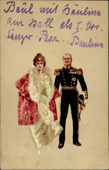Litho Liebespaar, Soldat in Uniform, Frau in weißem Kleid