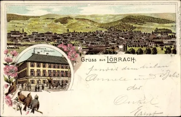 Litho Lörrach in Baden, Gasthaus zum Hirschen, Totalansicht