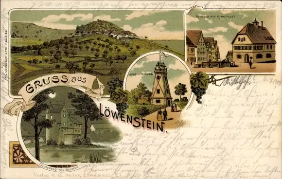 Litho Löwenstein Württemberg, Panorama, Rathaus, Marktplatz, Aussichtsturm, Theuserbad-Schlösschen