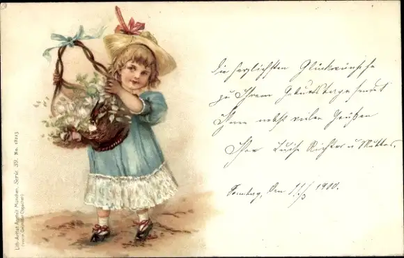 Litho Mädchen mit Blümenkorb, Geburtstag