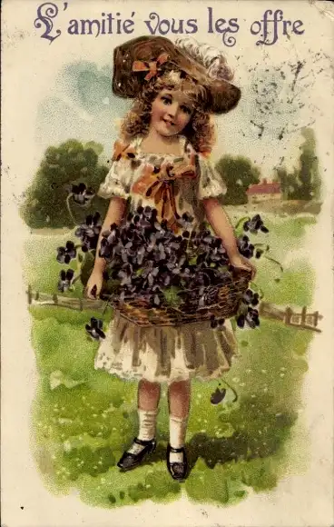 Litho Mädchen mit Blumen, Portrait, Freundschaft