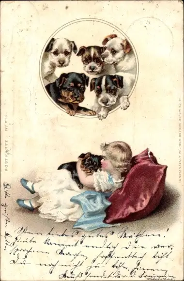 Litho Mädchen mit Hundewelpen