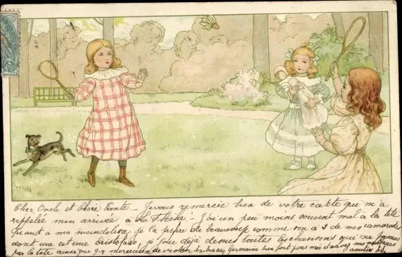 Litho Mädchen spielen Tennis, Tennisschläger, Hund, Puppe