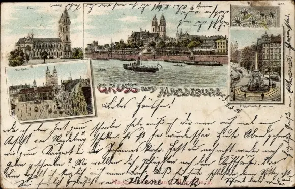 Litho Magdeburg, Alter Markt, Dom, Dampfer, Hasselbach Brunnen