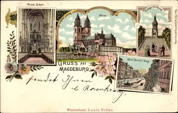 Litho Magdeburg, Der breite Weg, Dom, Chor und Kriegerdenkmal