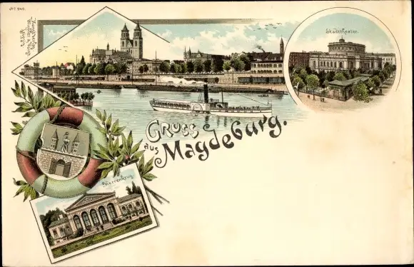 Litho Magdeburg, Dom, Panorama, Stadttheater, Herrenkrug, Wappen