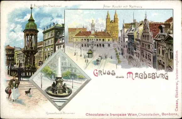 Litho Magdeburg, Kaiser Otto Denkmal, Alter Markt mit Rathaus, Hasselbachbrunnen