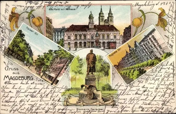Litho Magdeburg an der Elbe, Alter Markt, Kaiserstraße, Bismarck Denkmal, Augustastraße