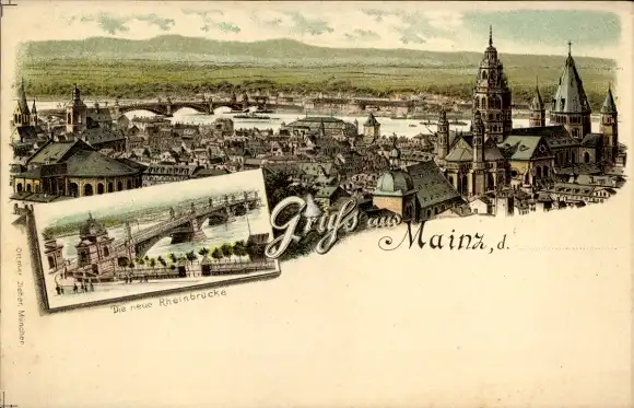 Litho Mainz am Rhein, Die Neue Rheinbrücke, Panorama