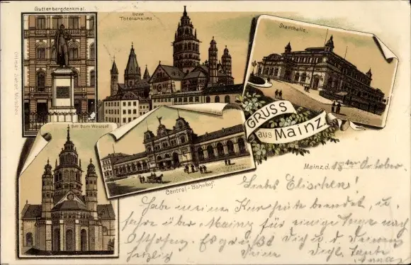 Litho Mainz am Rhein, Stadthalle, Dom, Bahnhof, Guttenbergdenkmal