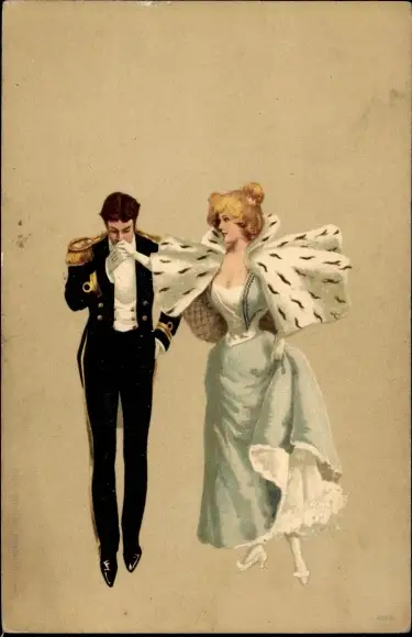 Litho Mann in Uniform, Frau im Kleid, Handkuss