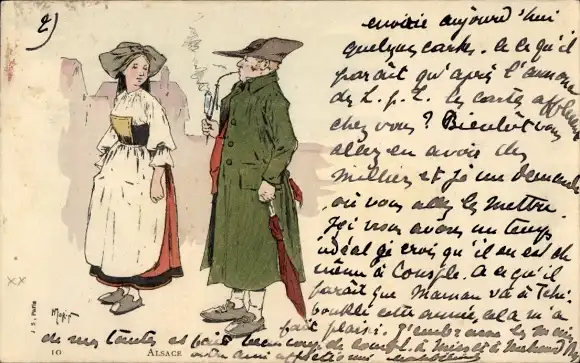 Litho Mann und Frau in Elsässer Trachten, Pfeife