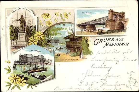 Litho Mannheim in Baden, Teilansichten, Rheinbrücke, Schiller Denkmal