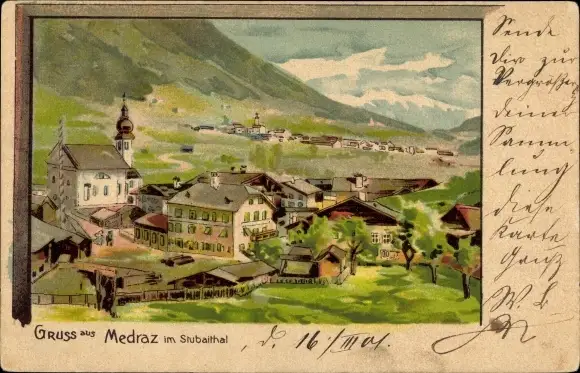 Litho Medraz Fulpmes in Tirol, Stubaital, Totalansicht vom Ort