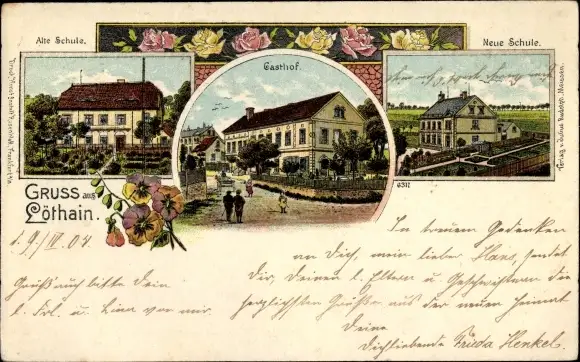 Litho Mehren Löthain in Sachsen, Alte Schule, Gasthof, Neue Schule, Blumen