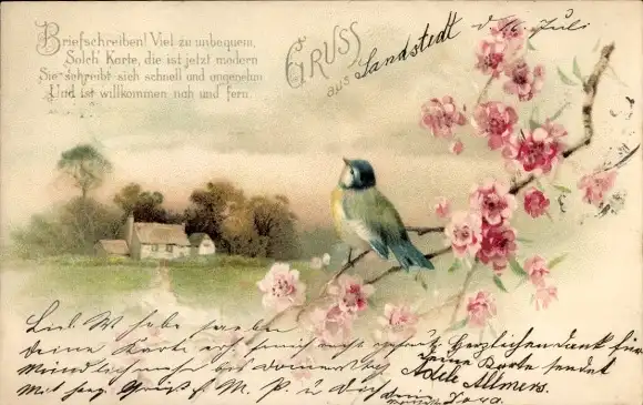 Litho Meise am Baum, Kitsch, Briefschreiben, viel zu unbequem