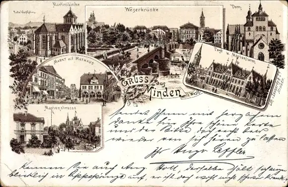 Litho Minden in Westfalen, Weserbrücke, Dom, Post, Markt, Rathaus