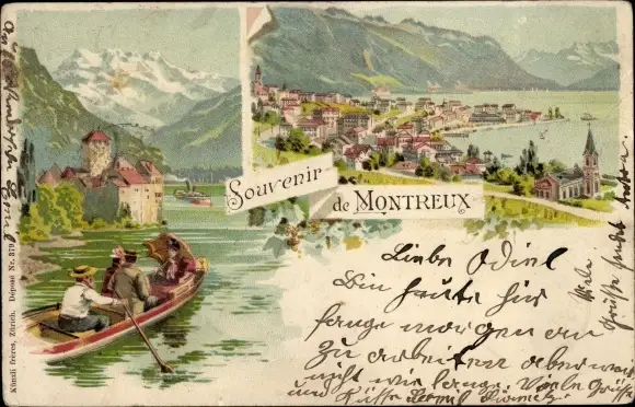 Litho Montreux Kanton Waadt Schweiz, Gesamtansicht, Ruderboot
