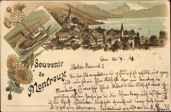 Litho Montreux Kanton Waadt Schweiz, Gesamtansicht, Schiff, Blumen