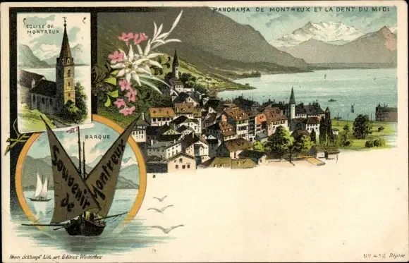 Litho Montreux Kanton Waadt Schweiz, Teilansicht, Kirche, Fischerboot