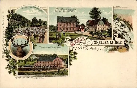 Litho Mosel Zwickau in Sachsen, Forellenmühle, Waldpark, Schießstand