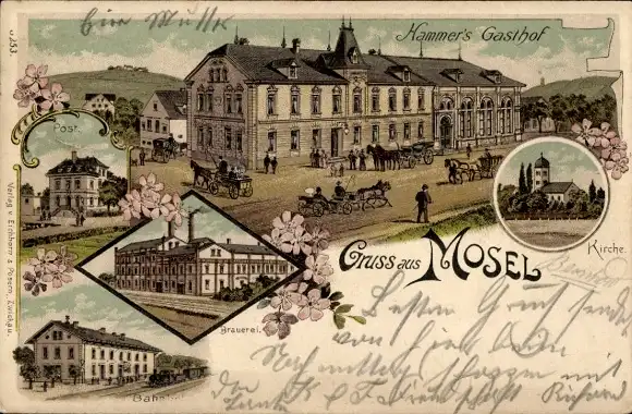 Litho Mosel Zwickau in Sachsen, Hammers-Gasthof, Post, Brauerei, Bahnhof, Kirche