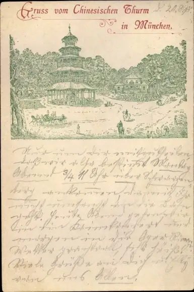 Litho München Bayern, Gruß vom Chinesischen Turm