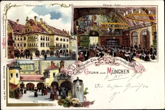 Litho München Bayern, Hofbräuhaus, Oberer Saal, Hof