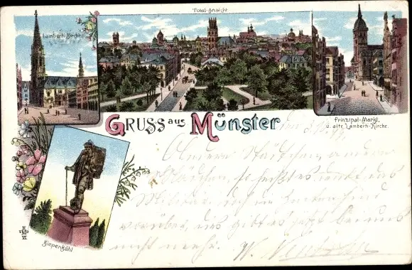 Litho Münster in Westfalen, Lambertikirche, Kiepenkähl, Prinzipalmarkt, Totalansicht