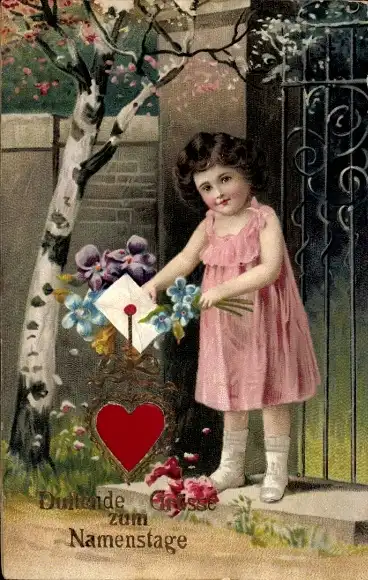 Litho Namenstag, Mädchen mit Brief, Blumen