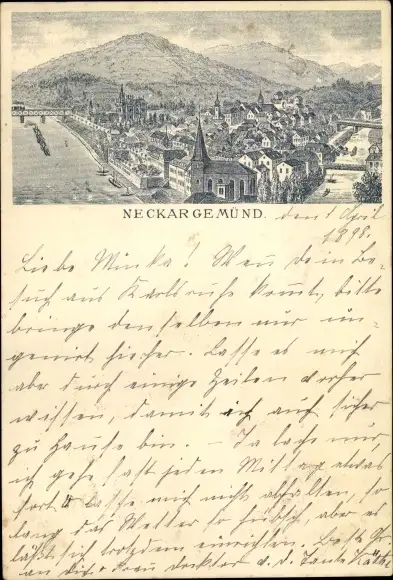 Litho Neckargemünd in Baden Württemberg, Totalansicht, Vogelschau, Brücken, Neckar, Elsenz
